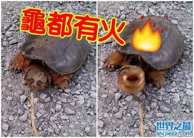 男子拿起木条撩拨龟龟面部,对方突然发恶张大嘴巴极速向男子扑去。