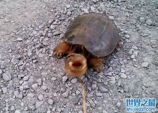 乌龟突然一改温吞形象,发恶张大嘴巴极速向男子扑去,吓得对方跌倒,连手上的镜头也掉了。