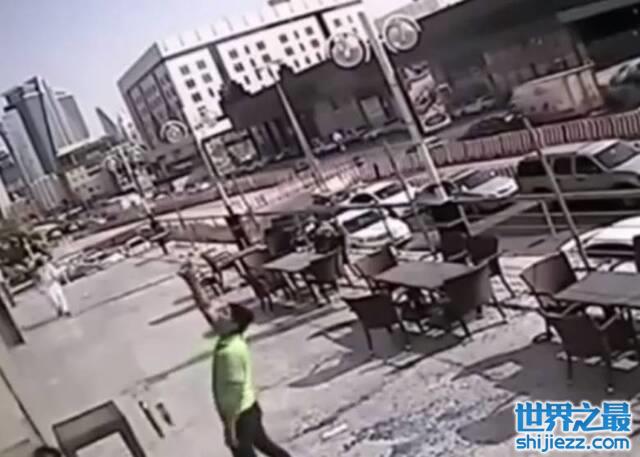 玻璃窗突然从天而降,贴边擦过男子的头,再掉在地上。
