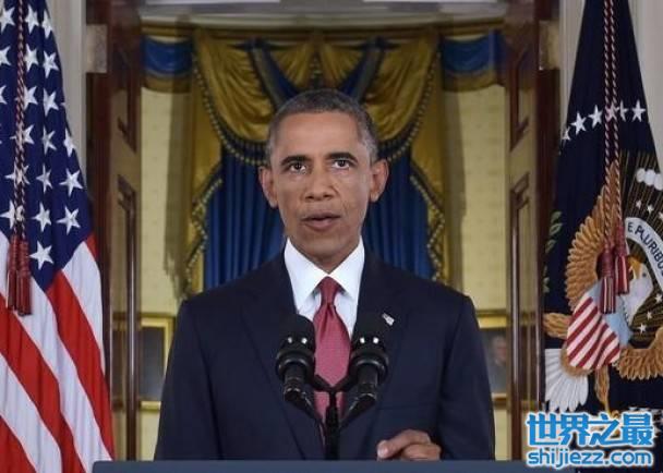 奥巴马站立的位置,头部刚好对上身后门上的标志。
