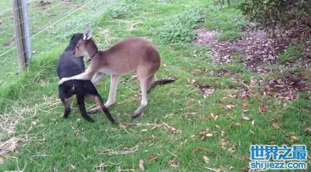 即使狗狗想离开,袋鼠仍捉住它不放。