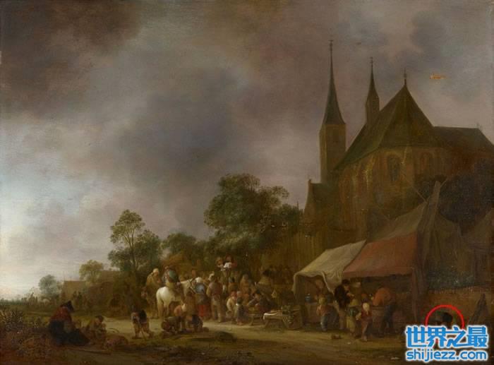 该幅名画题为《教堂前的农村市集》(A Village Fair with a Church Behind,直译),由17世纪荷兰知名画家范奥斯塔德(Isack van Ostade)于1643年所画。擅于描绘农民实况的他,于画中栩栩如生地勾勒出街角小贩叫卖食物、小孩于泥地上掷骰子的实景,就连一名男子在摊档边旁大解,亦如实描绘出来。
