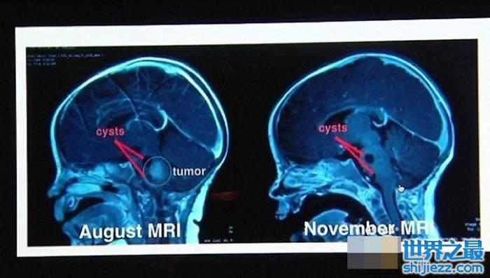 左图为8月时的脑扫描结果,右图为11月的。可见肿瘤(红圈示)大幅缩小。