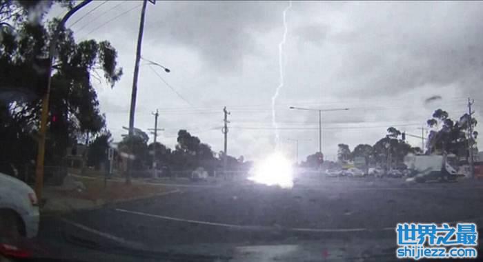 一辆正在十字路口等红灯的汽车携带的相机拍摄到一辆汽车被闪电击中尾部却毫发无损的惊人一幕