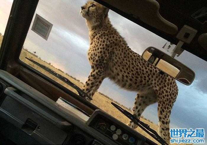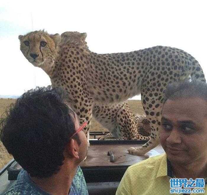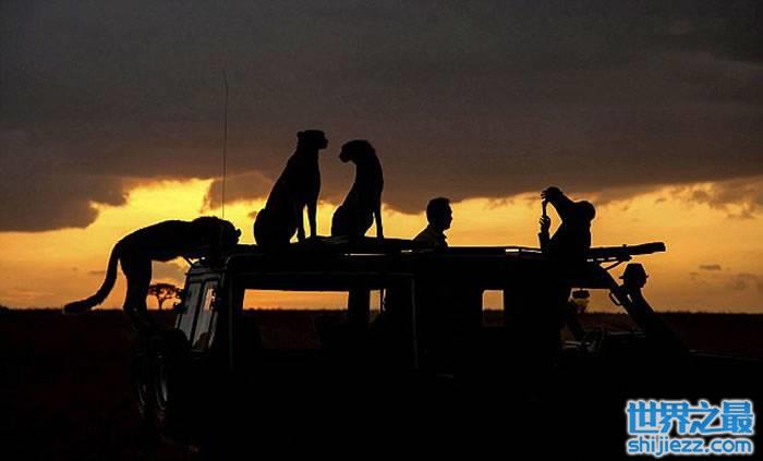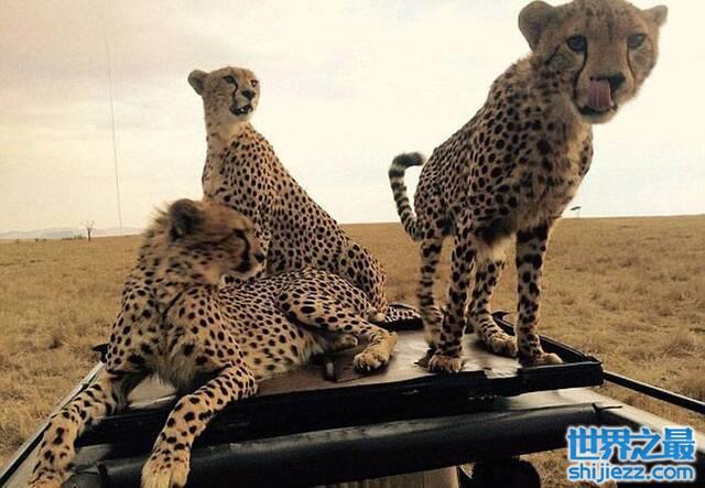 驾车游逛肯尼亚马赛玛拉国家公园时受到四只猎豹友善欢迎
