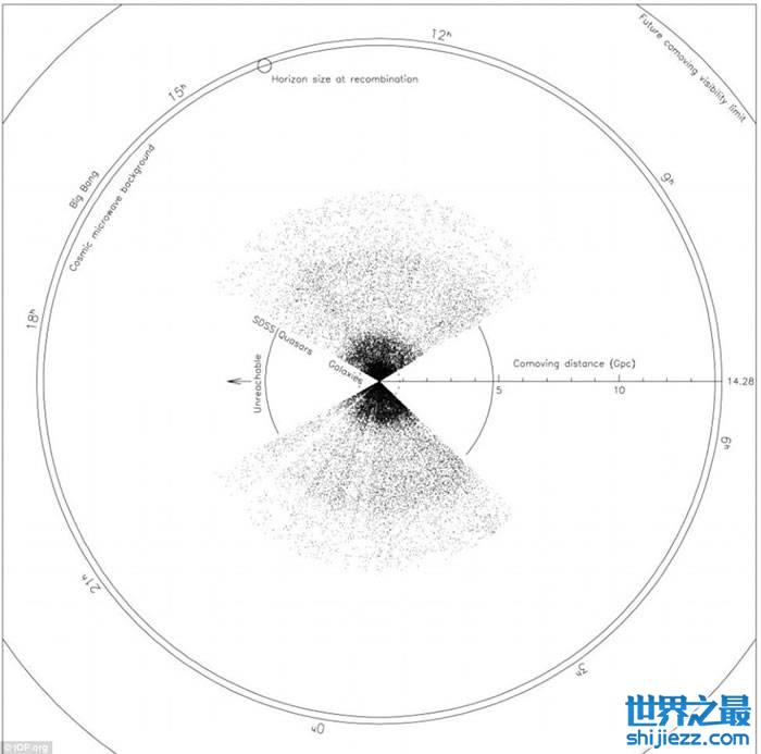 他参考的对数图来自于斯隆数字巡天系统(SDSS)。这种详细的三维地图包括了300多万个宇宙天体。SDSS对大约50万个天体拍摄了数千万张星系照片和三维定位。