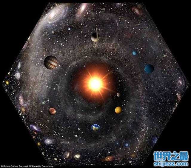 布达西表示:“当时我正为儿子画六角变形体(hexaflexagon),想把这个当成送给他的生日礼物。我开始以太阳系为中心绘制整个宇宙,此后突然冒出利用对数图展示宇宙的灵感。接下来的几天,我将美国宇航局抓拍的照片与我自己创造的纹理进行整合,最终画出了这张图。”