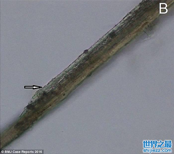 医生取出虫后,在显微镜下拍到这条罗阿罗阿丝虫(箭咀示)。