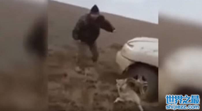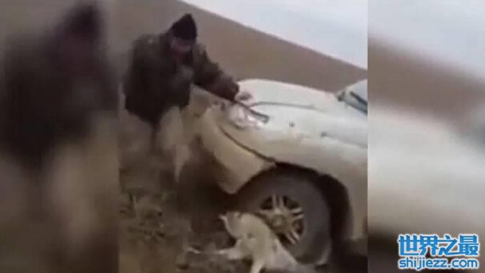 哈萨克斯坦猎人虐狼 开车碾压并用脚踢它的头部