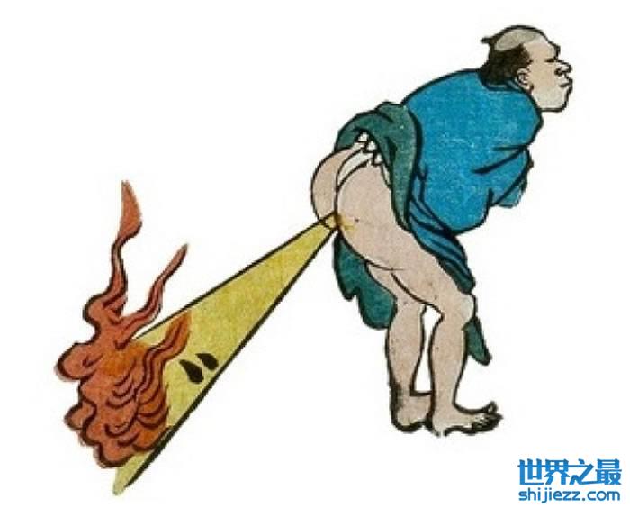 从画中可见,一名男子对着一团火放屁,而火团弹出两个火屑。放屁由于屁的日文发音为“へ”(he),而火的发音是“ひ”(hi),再加上火屑“"”,就等于“へび”,即蛇的发音。懂日文的读者要理解这谜语应不困难。