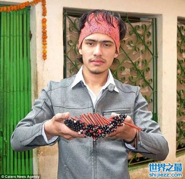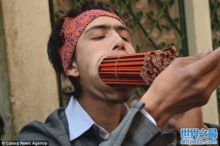 尼泊尔19岁青年Raja Thapa“超级大嘴巴”口插138支铅笔