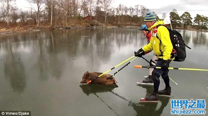 瑞典野猪被困冰湖中心 溜冰爱好者用溜冰棍相救