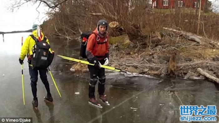 瑞典野猪被困冰湖中心,溜冰爱好者用溜冰棍相救