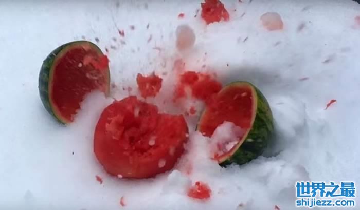 被雪球一射,西瓜果肉应声碎裂。