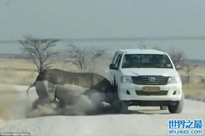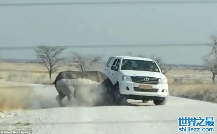 非洲纳米比亚埃托沙国家公园犀牛疑不满吉普车闯其领地直接冲撞 ...