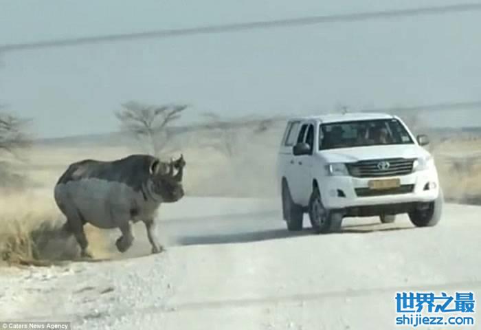 非洲纳米比亚埃托沙国家公园犀牛疑不满吉普车闯其领地直接冲撞