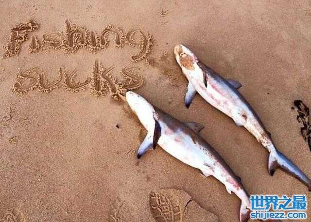 鲨尸旁边的沙上写有“捕鱼真讨厌”的英文字句。