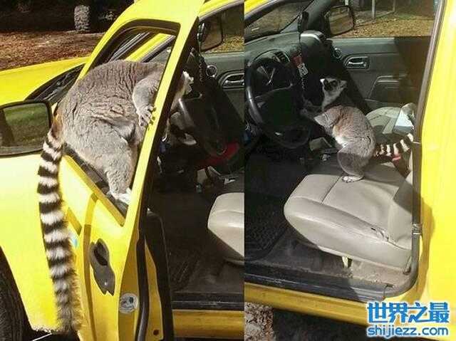 美国佛罗里达州一只环尾狐猴跳上卡车驾驶座握方向盘