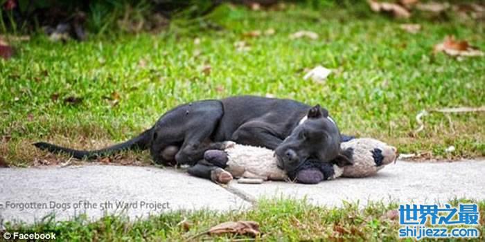 美国德州黑色流浪狗躺在街头紧抱绒毛娃娃 模样十分孤独可怜 ...