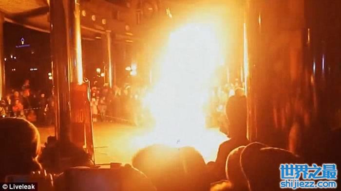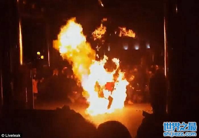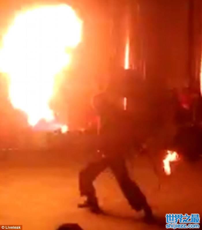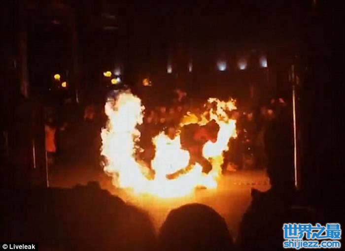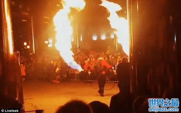 俄罗斯青年在表演火舞期间 疑因机件故障顿变火人