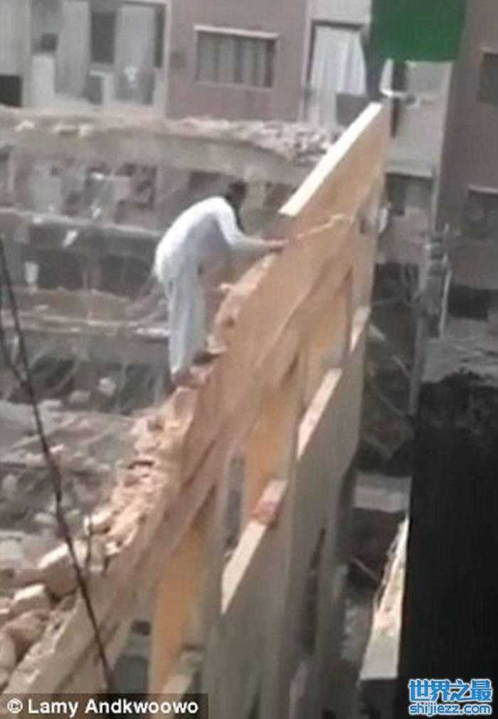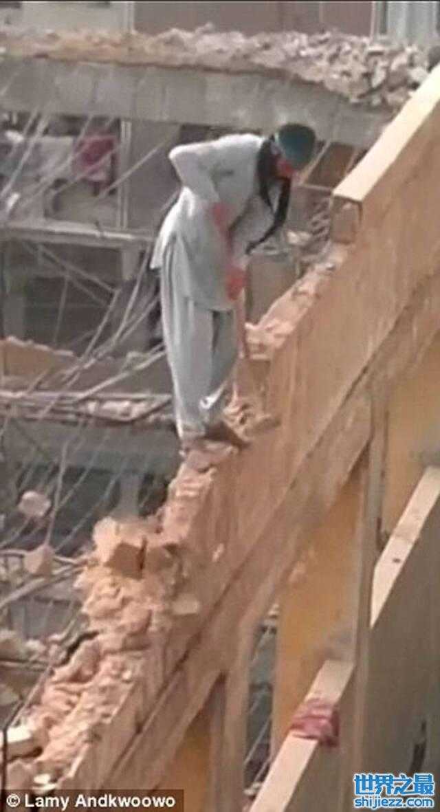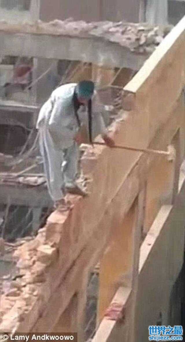 艺高人胆大:赤脚建筑工站墙拆楼无难度
