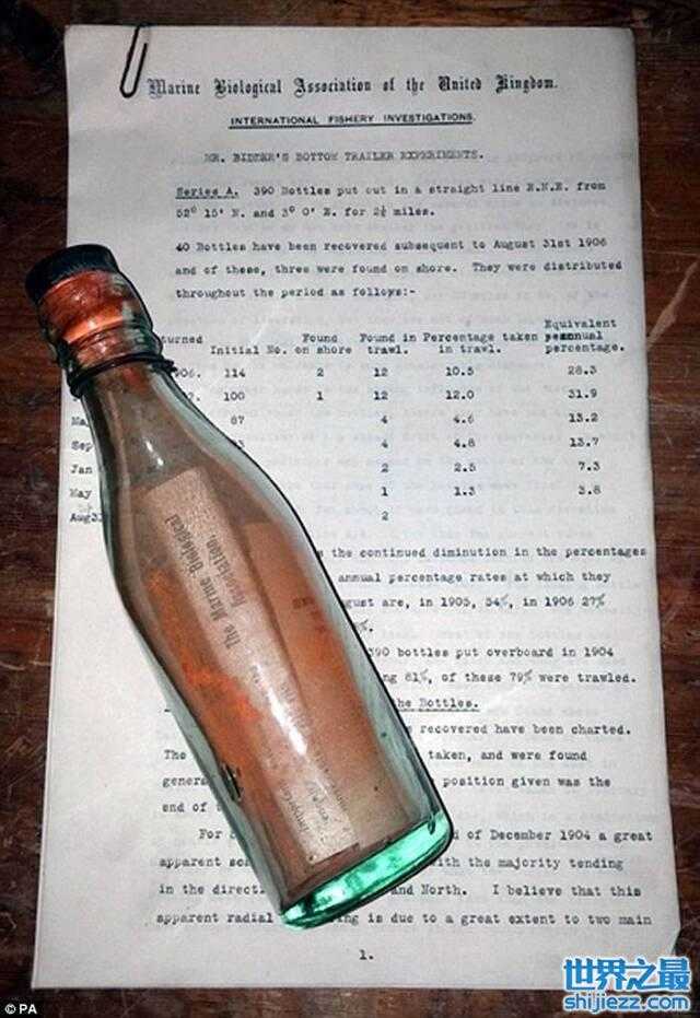 海洋生物学家比德(George Parker Bidder)当时正研究海水的流向,由1904年至1906年间,在海中放下约1000个瓶子,瓶中藏着信件。结果大部分瓶子都不知所终,唯独在德国阿姆鲁姆岛,一名退休邮差于去年4月17日发现这个瓶,并透过上面的资讯,找到比德当时所属的学术组织。比德已于1954年离世,享年91岁。