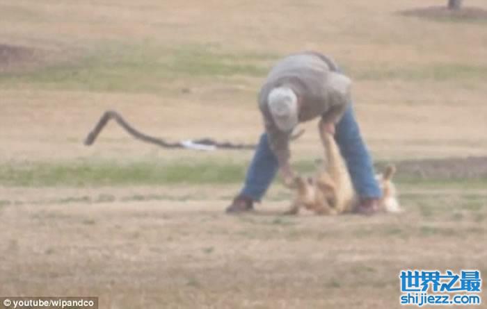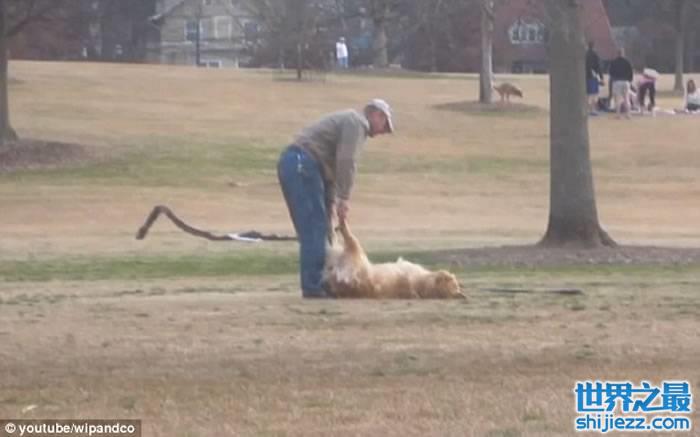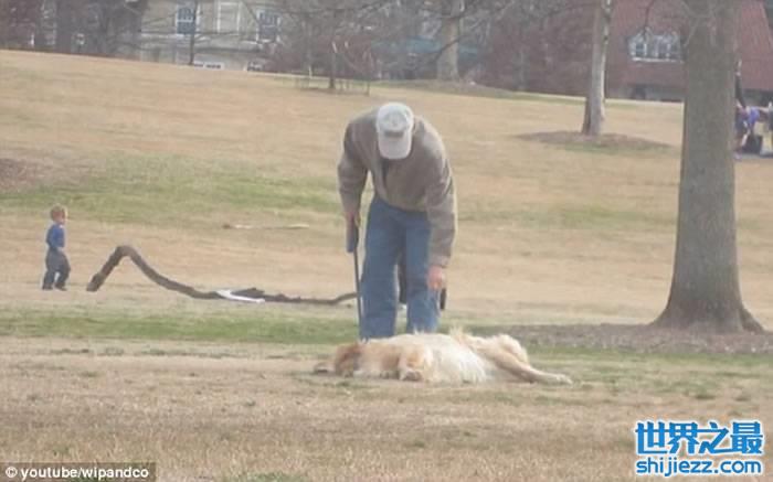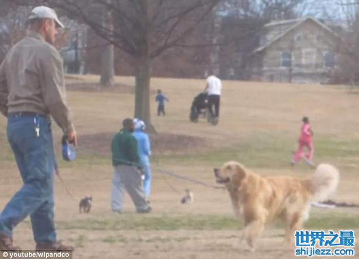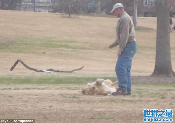 主人上前逗它玩却无功而回后,感到无可奈何,但最终却巧妙地用1条小木条将它引走,潇洒地牵着狗狗离去。