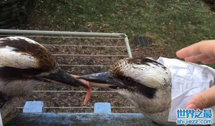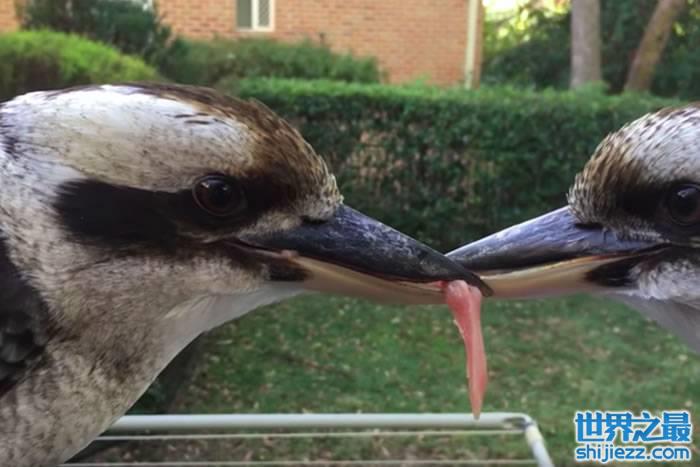 2只澳洲笑翠鸟嘴对嘴咬住一块肉僵持数小时 给另一块肉也不行 ...