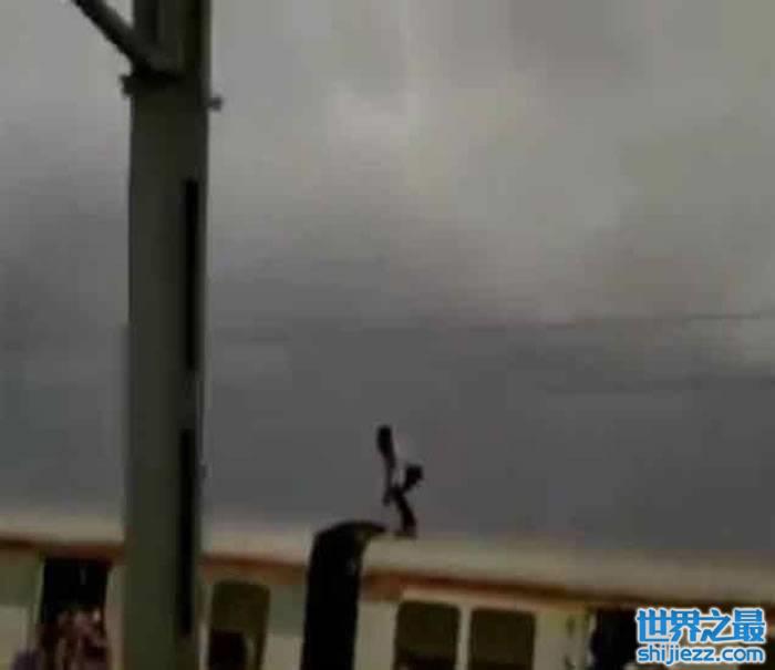 视频显示,火车高速飞奔,车顶却站了一名男子膝盖微弯,双手张开保持平衡,看到高压电缆就蹲低身体闪避,把危险举动当成特技表演。需知道,即使轻微触碰,都可以令男子一命呜呼。