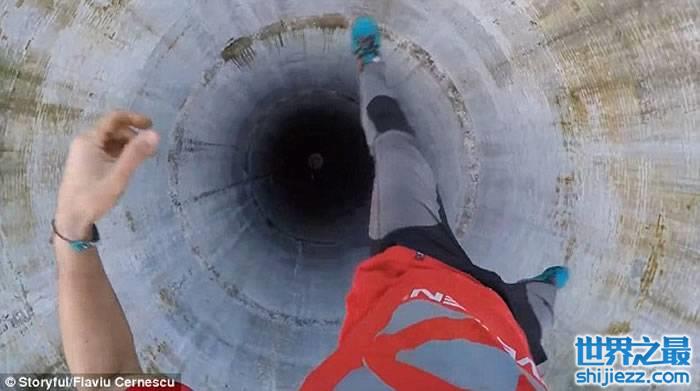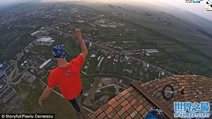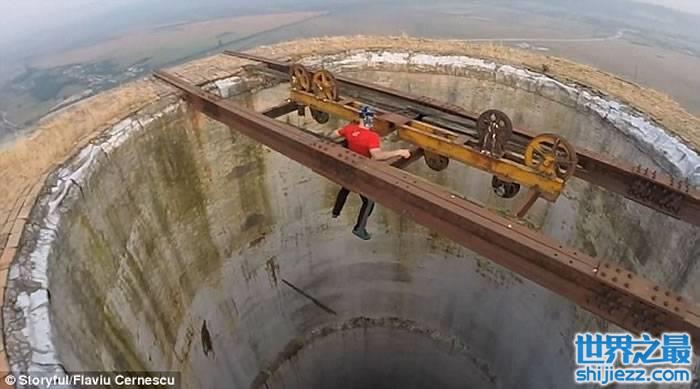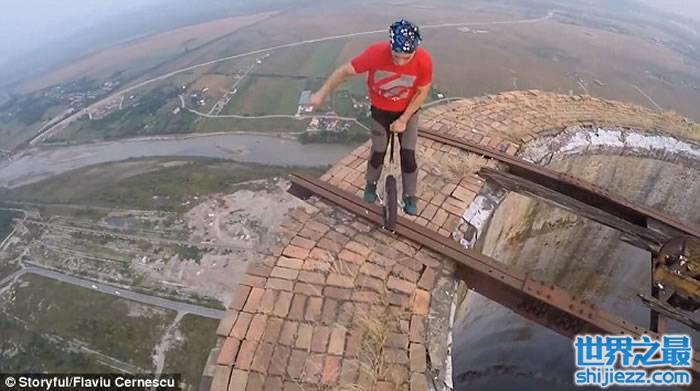 罗马尼亚男子玩命,在252米高烟囱顶踩单轮车