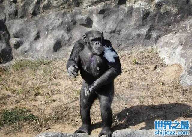 该只名为“杜鹃花”(Azalea)的19岁雌性黑猩猩,每日都要吃一包烟。当训练员向它抛上打火机,它就会点燃香烟,若没有获给予打火机,它更会聪明得拾起点燃的烟头取火。然而,动物园人员强调,它没有把烟吸进体内。