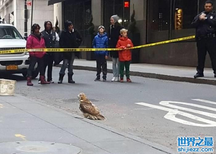 美国红尾鹰撞伤头部 呆呆降落曼哈顿街道