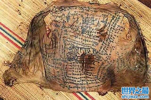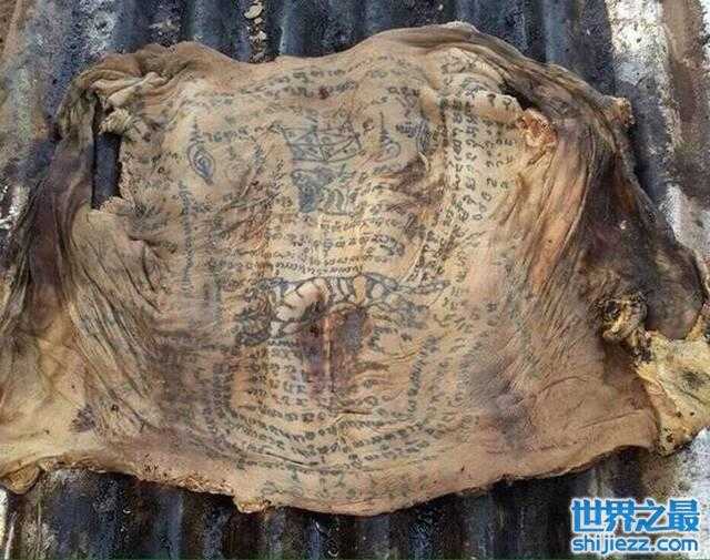 泰国一处墓地近日出土了一具腐尸,奇怪的是,尸体的皮肤完好无缺,而且满布奇怪的黑色纹身,犹如纹在皮肤上的咒语一样。当地人怀疑该块人皮上的纹身,就是传说中的“黑魔法”,令人心惶惶。