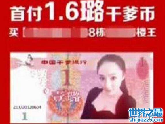 在论坛、贴吧等网站,出现了一则楼盘“广告”,“广告”上显示,该楼盘首付为1.6璐干爹币,“广告”的主体是与第五套百元人民币相似的正反面“票样”,而头像和背景却被ps成了杨紫璐和楼盘效果图。“广告”还解释了“新币种”“干爹币”一璐=10万元人民币。瞬间这张网友自制的“干爹币”引来了众多网友围观,并激起了一阵“吐槽”热。