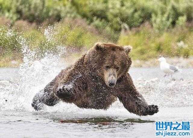 美国阿拉斯加州强壮灰熊飞身捕鱼似水上滑翔