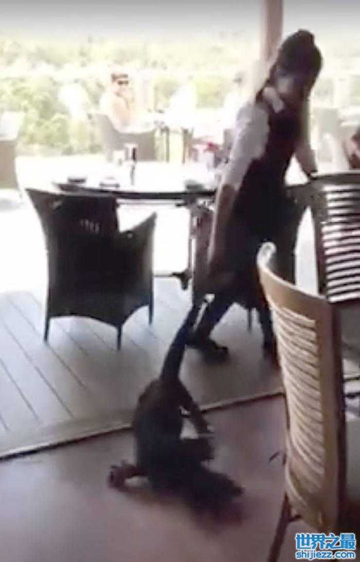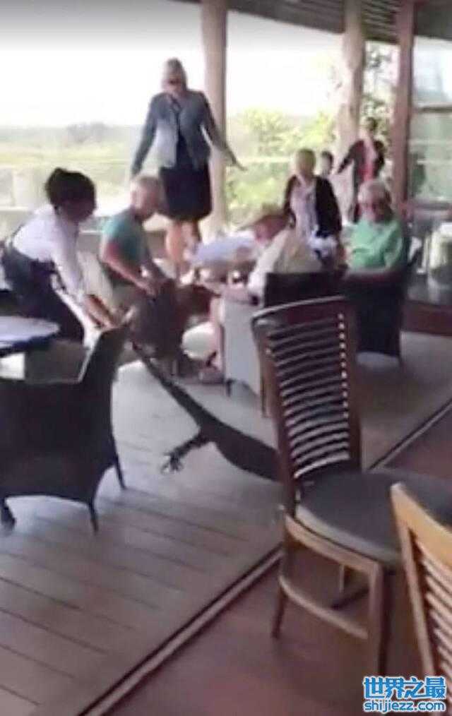 澳洲新南威尔士省巨蜥闯餐厅,女侍应徒手拽尾巴拖走