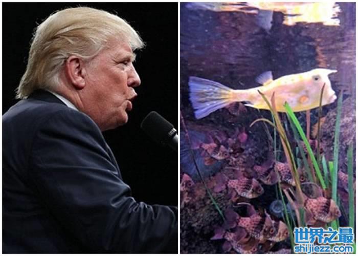 特朗普势力入侵水族界?英国曼彻斯特海洋生物中心有一条“特朗普”鱼,全因其侧面跟特朗普十分相似。一对鱼角及鱼唇,就如他那向上梳的前发及招牌式撅嘴,加上金黄色鱼身与特朗普发色亦相当近似,难怪拍摄者科林斯(Steve Collins)笑道,“一看见它它就想起特朗普了。”