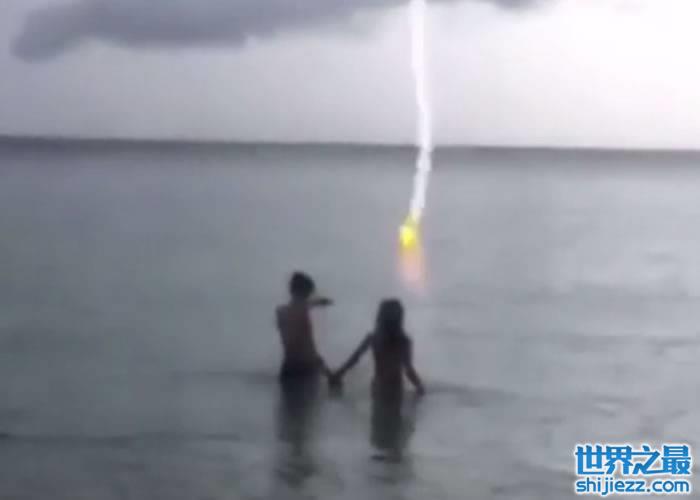 大胆男女在海中嬉水,远处一道雷电劈落海面,煞是吓人。