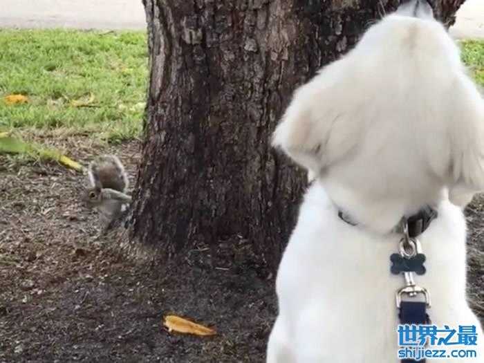 有一只白色大狗坚持守在树下,迟迟没有要离开,目光紧盯着树梢,一副想要找寻什么东西,结果,它想要找的松鼠其实就在它的脚前方,不断探头探脑,甚至还随着狗的目光往上看,却完全没被发现的样貌,相当滑稽。