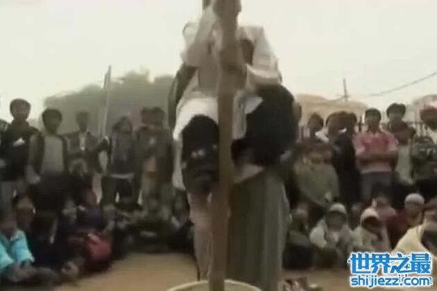 至于为什么能伸出来,其实把一个几米长的类似竹筒的空心物体埋到地下,中间放绳子,当有人在外面拉紧绳子的钢丝时,绳子就会变直变硬,这样就会伸直出来当小孩爬上去的时候,旁边就有人扶着,只是为了不让绳子弯曲,垂直是没有问题的。