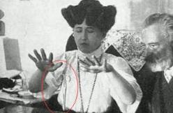 在英国心灵研究学会的网站上,有一张很吸引人的古老黑白照片,一位女士坐在桌前,她双手作势往上飘,桌面上的剪刀随着她的手势也浮了起来,悬在半空中,旁边有一位绅士正聚精会神地看着她的”表演”并认真地研究着,这是特异功能人的真实事件,这张照片也没有作假和PS。