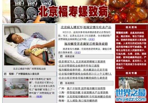 2006年8月,福寿螺的知名度迅速提高,差不多到了尽人皆知的程度,这种淡水螺起了一个很中国化的名字。但福寿螺一点也不福寿,因为它在传播一种很可怕的疾病。2006年就曾爆发过福寿螺的感染事件,一共有87例患者被感染。