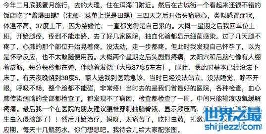 但就这四五个田螺,却让她归痛不欲生,辗转多家医院求医之后才发现是寄生虫感染,已经入侵脑部,本来已经怀孕的她不得不选择流掉孩子进行药物治疗,“可以说我的上半年基本都在医院渡过的,一共做了六次腰部穿刺,扎了将近300瓶水,吃了十几盒打虫药,因为用激素和药物,我脸和身材都变形了,头偶尔还会疼,应该是留下了永久性的损伤。”