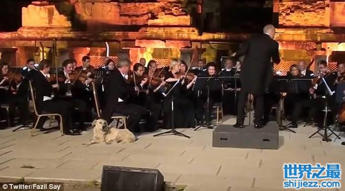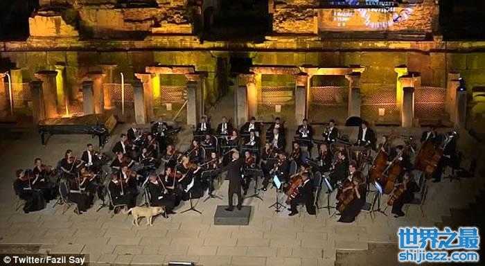 维也纳室内交响乐团(Vienna Chamber Orchestra)近日到土耳其西南部的以弗所古城(Ephesus)进行户外演奏,正当乐团演奏孟德尔颂第4号交响曲《意大利》时,突然来了一个不速之客——一只流浪狗霸气登台,并赢得现场观众掌声。