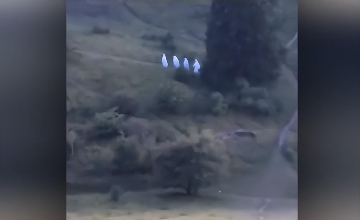 我们可以看到在远处,一群穿着白色连帽斗篷的神秘人,排成一排向坡上走去,因为距离太远,手机无法捕捉到哪里人明显的特征,不过就单从他们的打扮来看,那一群人就不是正常人,有些神秘。