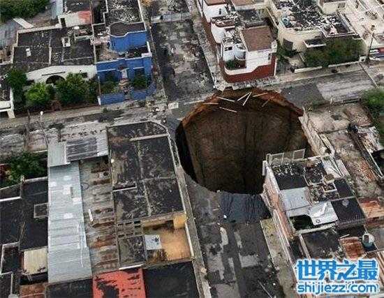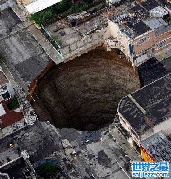 危地马拉天坑,它位于危地马拉城市区域。它出现于一零年,是一个长二十米,深度大约为九十米的大坑。这个天坑的突然出现,造成将近十五人的伤亡事故。据有关杂志推测,这个天坑可能是因为热带风暴引发而形成的,但也有可能是地下管网的泄漏形成。