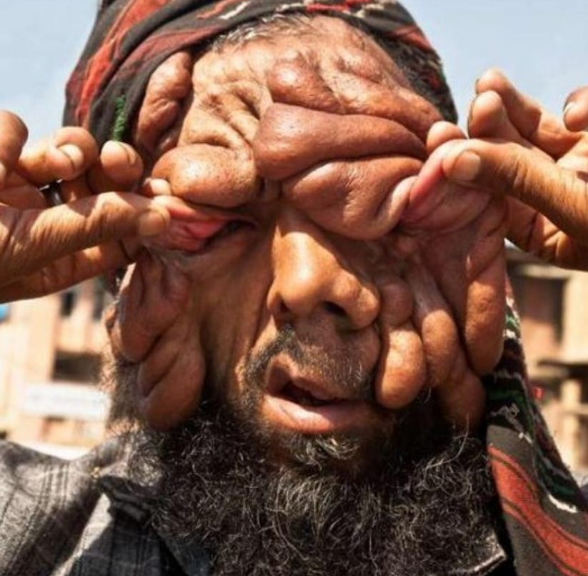 这个男人的名字叫做拉提夫。根据他自己所说,年轻的时候是非常的孤独,因为在左边没有任何一个孩子和同学会和这样一个丑八怪玩。在八岁的时候,他的眼睛已经被肿瘤覆盖的完全睁不开。三年之后拉皮夫,脸上的肿瘤也并没有停止生长,反而是越来越大。现在的他只能够坐在街边靠着乞讨来讨生活。可没有想到他居然还能够有妻子。
