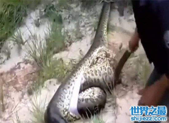 胆子比较大的人上去看看,远远的看见有花斑纹纹理,长长的类似于水管一样粗的物体躺在那边,有人慢慢凑上去,走近了一看就被吓到坐在了地上,这哪是什么水管啊,这是一个黄色纹理的,非常长的巨型蟒蛇,这时候蟒蛇一动不动的感觉是有点受了伤昏迷了。
