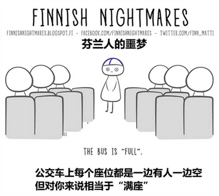 芬兰人的社恐程度可能是大家无法想象的,比如说听到外面有邻居正在走路,那自己想要出门就会憋着。再或者说公交车上的双人座做了其中一个人,另外的人就算站着也不会去坐控制的座位。甚至于公园里面的椅子也都是很78,避免让这些芬兰人有目光交集的机会,看得出来分男人的射控理念已经是深入骨髓了。