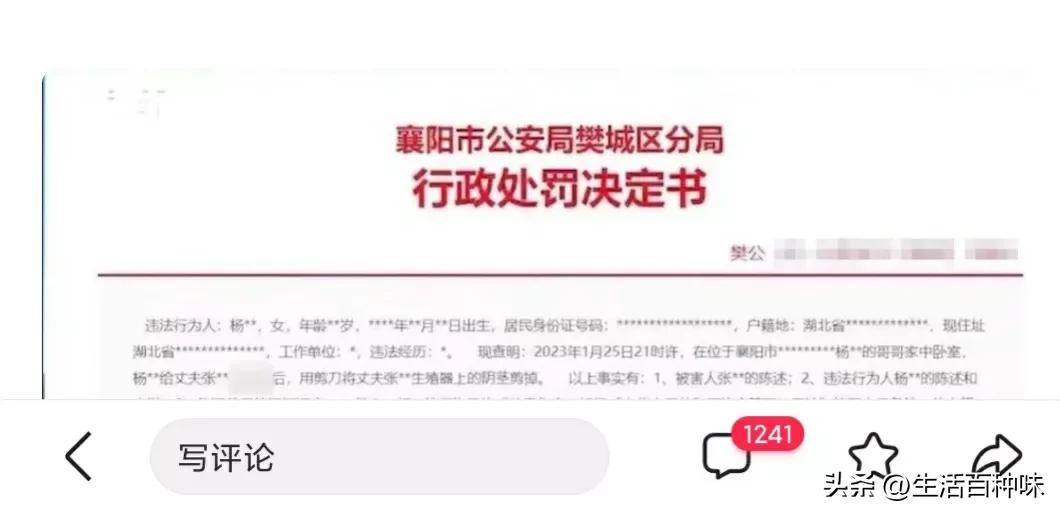 1月26日,网友发现湖北公安执法公开平台上的一份《行政处罚决定书》显示:“襄阳一女子因用剪刀剪掉丈夫阴茎,被行拘十日罚款二百元”。